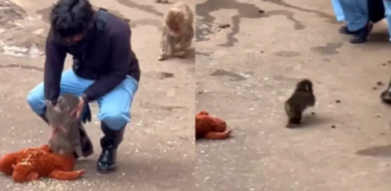 Sin embargo, Punch no mostró interés alguno en quedarse solo. Ignorando completamente el alimento y el juguete, el macaco corrió inmediatamente hacia su cuidador, sujetándose de su pantalón en una clara señal de que prefería la compañía humana. Ante esta reacción, el trabajador no tuvo más remedio que recoger tanto al mono como a su peluche y llevarlos consigo.