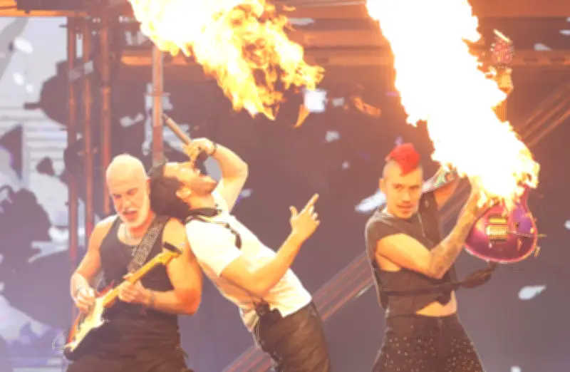 El espectáculo comenzó con el despliegue de los músicos que recibieron a Sebastián Yatra sobre una estructura metálica que simulaba los andamios de una construcción, con imágenes en blanco y negro de fondo.