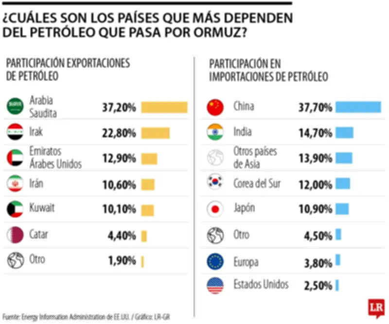 Según datos de la Administración de Información Energética de Estados Unidos correspondientes al primer trimestre de 2025, la distribución de las exportaciones de crudo a través del estrecho de Ormuz está dominada por cuatro países: