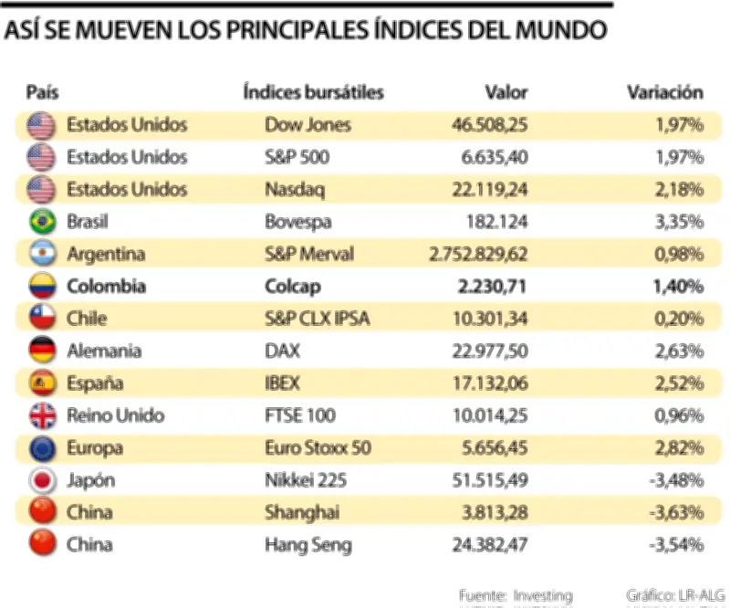 En contraste, los principales índices bursátiles mostraron ganancias sustanciales. El S&P 500 avanzó un 2%, mientras que el Nasdaq 100 registró un incremento del 2,1% y el promedio industrial Dow Jones ganó un 2,2%. En el mercado europeo, el índice Stoxx Europe 600 subió un 1,9%.