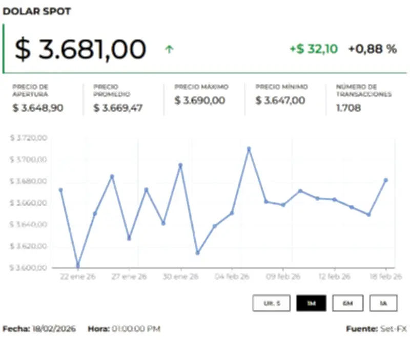La divisa estadounidense abrió la sesión de este jueves con un significativo incremento en el mercado cambiario colombiano, situándose en $3.694,90, lo que representa un ascenso de $25,69 frente a la Tasa Representativa del Mercado (TRM) establecida para hoy en $3.669,21. Durante los primeros minutos de negociación, específicamente hacia las 8:05 a.m., la moneda tocó un mínimo de $3.694 y alcanzó un máximo de $3.698, con un volumen inicial de 5 transacciones por US$1,5 millones.