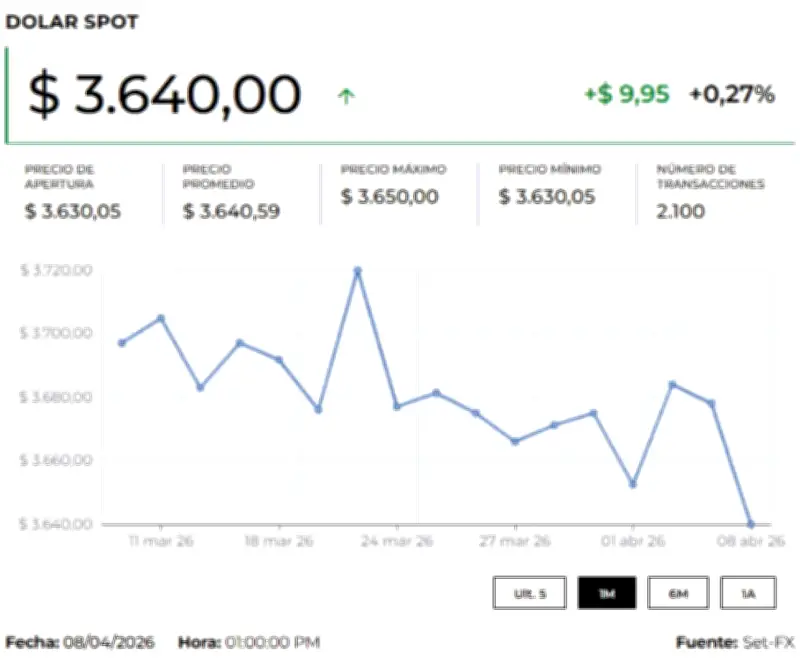 El dólar abrió la jornada del jueves 9 de abril de 2026 con una marcada tendencia al alza, situándose sobre $3.669,69, lo que representó un incremento de $29,06 frente a la Tasa Representativa del Mercado (TRM) que para hoy se ubicó en $3.640,63. La divisa estadounidense registró un mínimo de $3.660 y un máximo de $3.670 durante la sesión, con un total de 10 movimientos por un valor de US$3 millones.