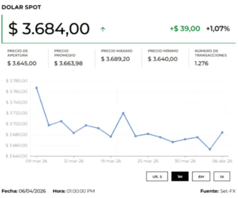 En el mercado colombiano, la divisa estadounidense abrió la jornada con una clara tendencia alcista, cotizando sobre $3.686,80. Esta cifra representa un aumento de $22,2 frente a la Tasa Representativa del Mercado (TRM) establecida para hoy en $3.664,41. Durante la sesión inicial, la moneda tocó un mínimo de $3.683 y un máximo de $3.690, con apenas 3 movimientos que totalizaron US$1,5 millones en operaciones.