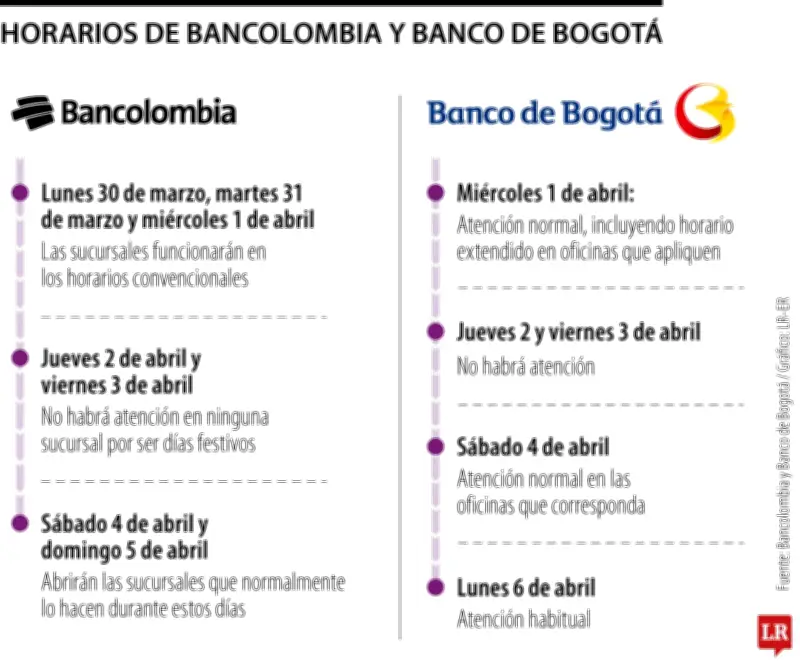 El Banco de Bogotá ha detallado su calendario operativo para la semana del 30 de marzo al 6 de abril de 2026: