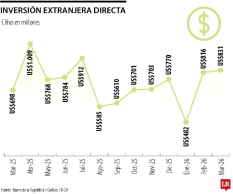 En el tercer mes del año, específicamente en marzo de 2026, la IED se ubicó en US$831 millones, lo que significa un aumento significativo del 19% en comparación con el mismo mes del año anterior. Este crecimiento mensual indica una recuperación en los flujos de capital extranjero durante este período específico.