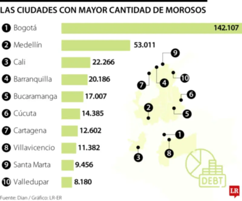 A pesar de este avance significativo, la entidad señaló que todavía existen 382.599 contribuyentes con obligaciones pendientes, cuyo monto asciende a 30,8 billones de pesos. Las ciudades con mayor concentración de deudores son Bogotá (142.107), Medellín (53.011), Cali (22.266) y Barranquilla (20.186). También se destacan Bucaramanga (17.007), Cúcuta (14.385), Cartagena (12.602), Villavicencio (11.382), Santa Marta (9.456) y Valledupar (8.180).