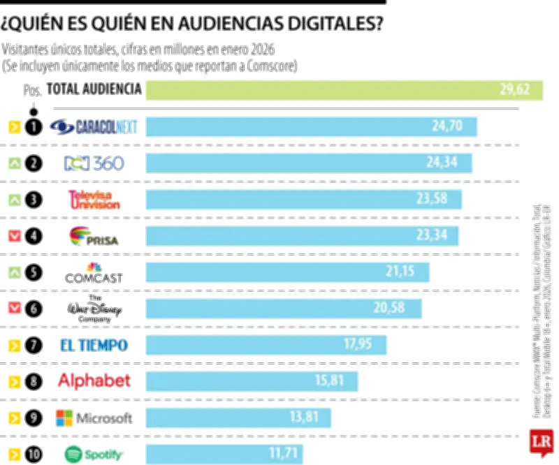 El listado de los diez primeros lugares incluyó además a Prisa con 23,34 millones de usuarios, Comcast - NBC Universal con 21,15 millones, The Walt Disney Company con 20,58 millones y El Tiempo Casa Editorial con 17,95 millones. Estas cifras evidencian la consolidación de conglomerados mediáticos internacionales en el mercado digital colombiano, junto con actores locales de gran trayectoria.