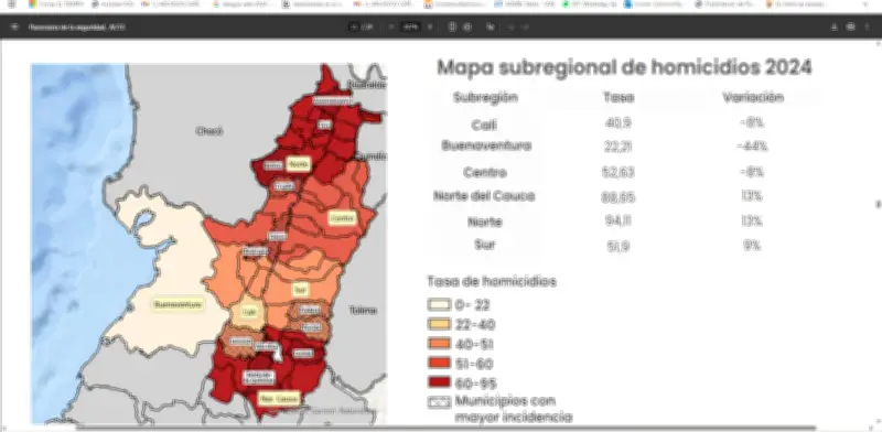 Según datos de la Red Regional de Observatorios de Seguridad, las subregiones del norte del Valle y norte del Cauca presentan las tasas más altas de homicidio en toda la región, con 94,11 y 88,65 homicidios por cada 100.000 habitantes respectivamente. Ambas zonas registraron un incremento del 13% en los homicidios entre 2023 y 2024, según el informe de la organización.