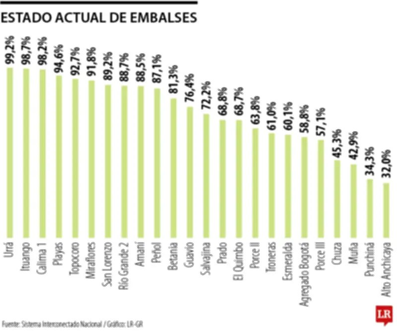 El Sistema Interconectado Nacional también informó que otros nueve embalses, incluyendo Guavio, Salvajina, Prado, El Quimbo, Porce II, Troneras, Esmeralda, Agregado Bogotá y Chuza, mantienen porcentajes de Volúmenes Útiles Diarios entre el 57,1% y el 76,4%.