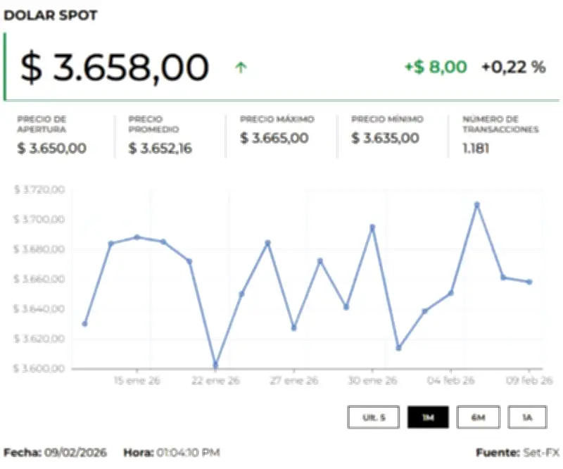 El dólar abrió este martes 10 de febrero de 2026 con un marcado incremento en el mercado cambiario colombiano, cotizándose inicialmente en $3.674,75, lo que representa un aumento de $22,85 frente a la Tasa Representativa del Mercado (TRM) establecida en $3.651,90 para la jornada. Durante los primeros minutos de operaciones, hacia las 5:05 a.m., la divisa estadounidense registró un mínimo de $3.674 y alcanzó un máximo de $3.677,9, con un total de 10 transacciones realizadas en ese período inicial.