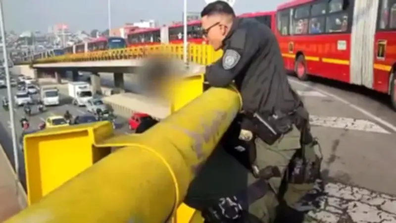 Un video capturó el dramático momento en que uniformados de la Policía Nacional evitaron que un menor de 17 años se lanzara desde un puente vehicular en Bogotá. La intervención, que ocurrió en la intersección de la calle 6 con carrera 30, demostró la rápida reacción de los agentes que transitaban por la zona y lograron sujetar al adolescente justo cuando intentaba atentar contra su vida.